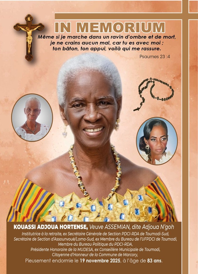 l’âge de 83 ans, Kouassi Adjoua Hortense veuve Assemian dite Adjoua N’Goh était la Secrétaire Générale