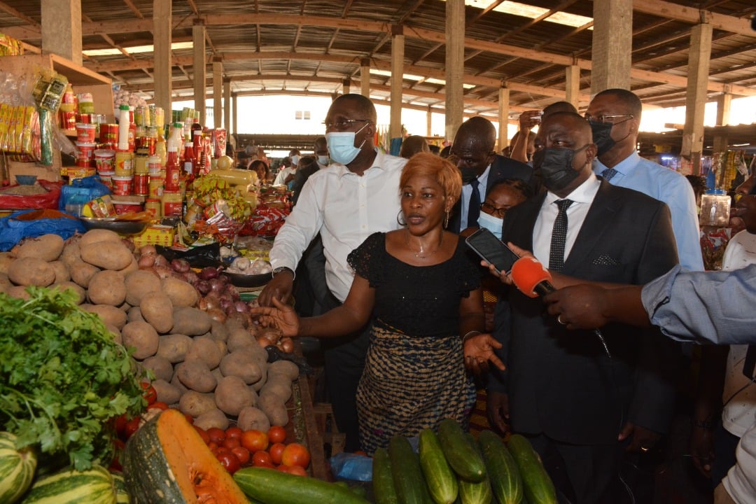 Une délégation du gouvernement ivoirien conduite par le ministre d État, ministre de l’agriculture et du développement rural, Kobenan Kouassi Adjoumani et composée des ministres de l’industrie et du commerce , Souleymane Diarrassouba, des Ressources Halieutiques, Sidy Touré, et de la Communication et des Média, porte parole du gouvernement, Amadou Coulibaly, s’est rendue sur le terrain de la production industrielle et alimentaire, et sur quelques marchés en gros d’Abidjan pour s’imprégner des réalités .la visite du ministre d’État en charge de l’agriculture et du développement rural se situe dans le contexte de la hausse du marché constatée par les consommateurs , notamment aux niveaux des produits alimentaires de premières nécessités , dont l huile, le ministre d’État Kobenan Kouassi Adjoumani et sa délégation se sont d’abord rendus à la zone industrielle de Yopougon , à la société Africaine de raffinage en Côte d’Ivoire, entreprise productrice des produits dont l’huile Aya. Dans cet établissement qui produit en moyenne plus de 650: tonnes par jour, les travailleurs étaient à l’oeuvre et aucun signe de pénurie n’a été signalée. Le ministre Adjoumani et sa suite se sont rendus au marché Dominique Ouattara du quartier Selmer de Yopougon. Là le constat a été fait de la présence des produits sur le marché. Puisle super marché Cosmos de Yopougon a reçu la visite de la délégation gouvernementale. L’issue de cette visite , le chef de la délégation, le ministre Adjoumani a livré ses impressions et donner les recommandations du gouvernement du Premier Ministre Patrick Achy » Sous instruction du Premier ministre, nous avons visité une unité de production et nous avons fait clé constat qu il ya de l’approvisin à sassieter. Et les marchés sont correctement fournis. Nous avons constaté qu’un niveau des super marché, les prix sont moins chers que sur le marché car effectivement les prix connaissent effectivement une flambée. Il ya quelque chose à comprendre. L’objectif c’est de faire que les prix vont identiques. Mais ce n’est pas le cas, le gouvernement se bat pour faire en sorte que les choses se passent ici. Nous sommes en train de réfléchir. Nous partons cependant édifié de savoir que les populations apprécié cette visite » a indiqué le ministre Adjoumani. Le ministre de l’industrie et du Commerce a indiqué pour sa part qu’il ya eu une légère augmentation du prix de l’huile mais les négociations franches avec les usiniers ont permis d’obtenir un prix qui n’écrase pas le pouvoir d’achat. Nous y reviendrons
