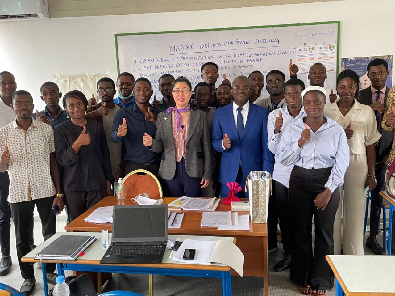 Le mardi 1 er Septembre a été marqué par la rentrée officielle de la 4è promotion du Master études coréennes (MEC-2022-2024). Trente étudiants dont 4 femmes et 26 hommes composent la 4 ème génération du Master en étude coréenne de l’Université Félix Houphouët Boigny. Ils sont issus de différentes Unité de Formation et Recherche (UFR) à savoir l’UFR Sciences économiques et de gestion, UFR des sciences juridiques, administrative et politique, UFR des Sciences de l’homme et de la Société, UFR des langues, littératures et civilisations LLC. Ils ont été admis au master suite à une sélection qui s ‘est déroulée en trois phases à savoir ; L’étude de dossiers, les tests écrit et oral et la rédaction d’un projet de mémoire d’au moins 20 Pages. La cérémonie de la rentrée qui s’est déroulé en salle 35 de l’UFR des sciences économiques et de gestions a été marquée par la présence du Professeur BALLO Zié, Président de l’Université Félix Houphouët Boigny. Le Président de l’université, prenant la parole a félicité les 30 candidats retenus. Il leur a présenté le programme études coréennes de l’Université Félix Houphouët Boigny.